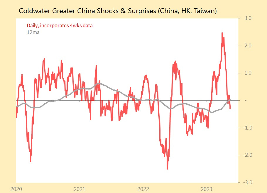 China's April data tells us there's little underlying cyclical momentum once the authorities take their foot off the credit accelerator. Remember, April's lending and monetary data showed a monetary stimulus being withdrawn, with Rmb bank lending rising only Rmb710, which was only Rmb 60bn above the amount of new lending in April 2022, and the monthly movt was 0.7SDs below historic seasonal trends. Take into account all other funding sources, and aggregate financing rose by only Rmb930bn, the main other sources being government and corporate bond offerings.