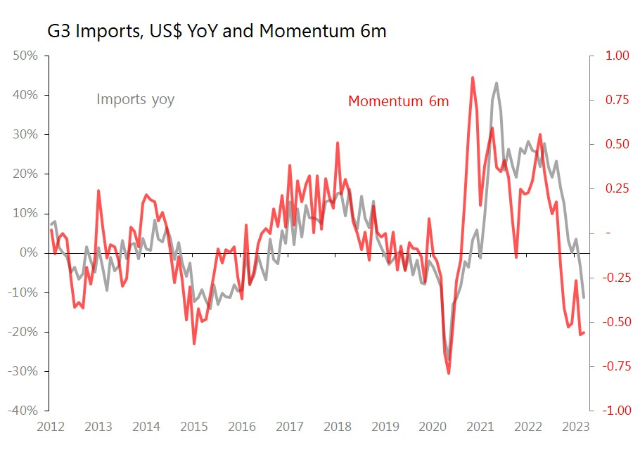With the domestic economy resisting take-off (yes, retail sales were up 18.4% yoy but the monthly movt was 0.1SD below historic seasonal trends), China's cycle will rest more heavily on external demand. Yet, imports from the M3 (US, Eurozone, Japan) are hardly encouraging, with imports falling in yoy terms, and, more importantly, with underlying sequential momentum about as discouraging as we've seen in the last decade, excluding the initial onset of the pandemic.
