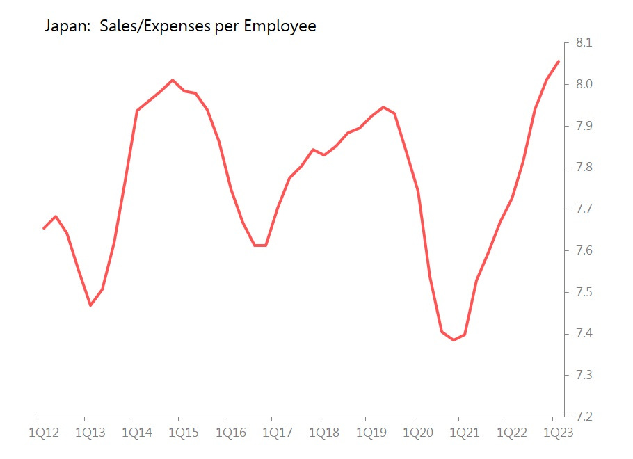 As for corporate tactics and strategy, two things stand out. First, management is working its workforce harder, with sales per employee rising 6.8% yoy but expenses per employee rising only 2.4%. The result is the highest employee sales/expenses ratio since 2010 at 8.06x.