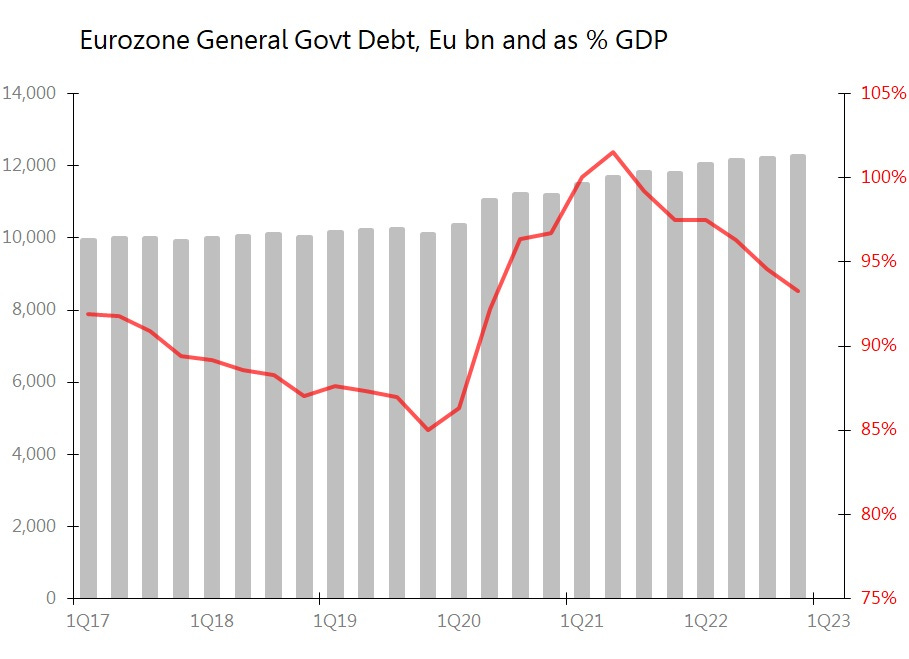 However, the pace of growth of government, having slowed against trend during 2Q and 3Q last year, once again started accelerating in 4Q. By the end of the year, outstanding government debt was up 3.8% yoy (vs 3.4% in 3Q), but with 12m nominal GDP growing at 8.4%, the debt/GDP ratio declined to 93.3% of GDP. That was down 1.3pps from 3Q22 and 4.2pps from 4Q21 - inflation doing a fine job of deflating away Eurozone government debt.