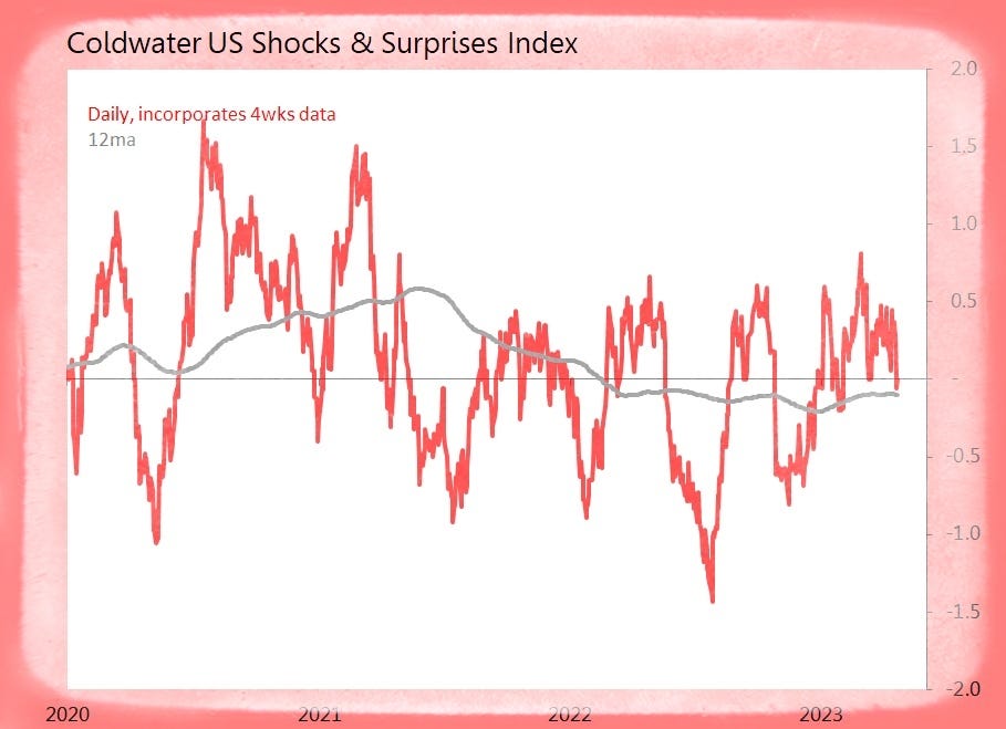 Summary: 20 datapoints tracked today, generating five surprises and two shocks. But for now, the rise in the global index has stalled.