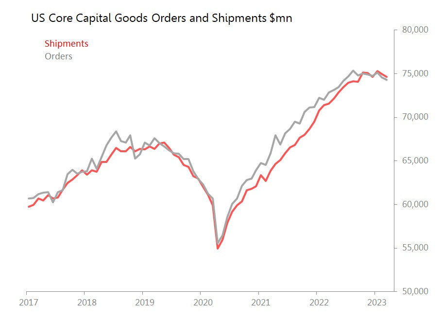 This was seen again in March’s US core capital goods orders and shipments data, which showed core capital goods (ie nondef ex-air) orders and shipments both down 0.4% mom. By themselves these are disappointing but not disastrous: however, they extend a plateau in orders which peaked in August 2022, and in shipments which peaked in October 2022. Re-tooling post-covid is plainly over.