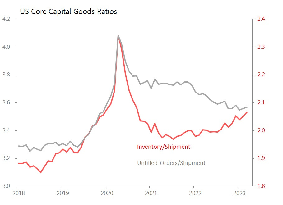 The danger is less of a sudden collapse than a continued and sustained leaking away of momentum. This is what is suggested by the key ratios for the US core capital goods sector, where the inventory/shipment ratio continues to climb, and in March had reached the highest point since mid-2020. Meanwhile, unfilled orders continue to be very gently eroded, down a further 0.1% mom - this is the sixth consecutive month where backlogs have either fallen or have been static.
