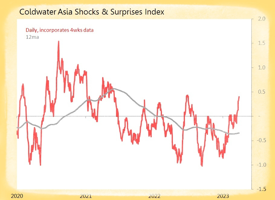 Summary: 17 datapoints tracked today, generating five surprises and five shocks. The global index is steady, and climbing.