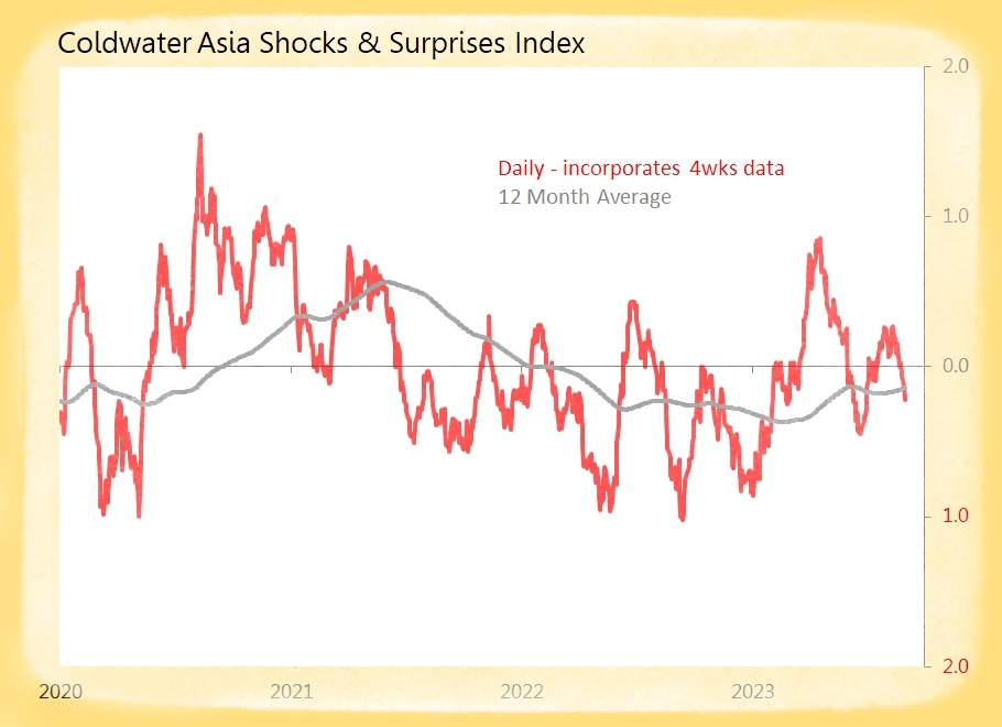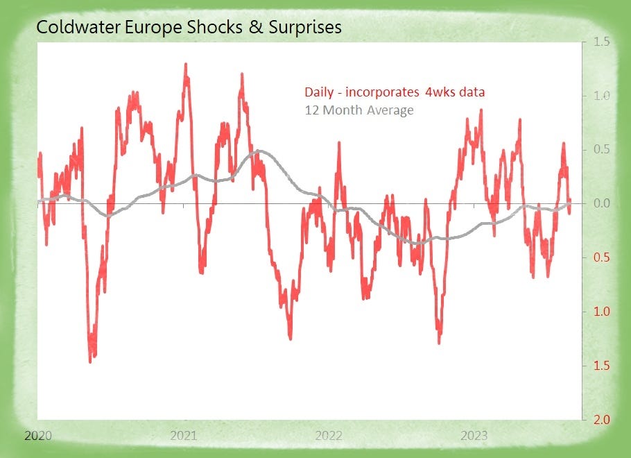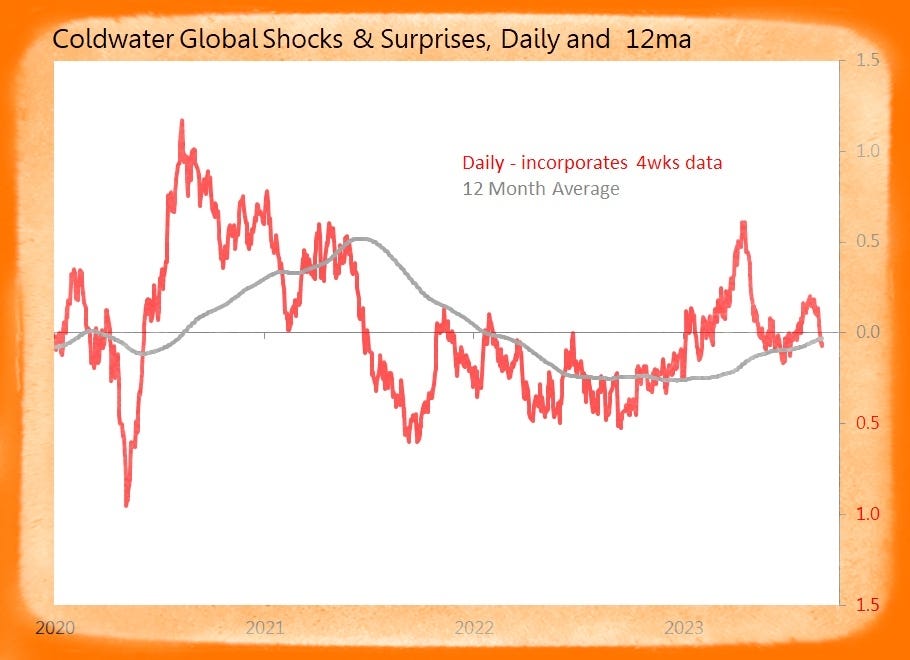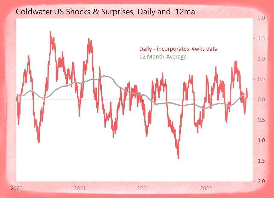 Summary: Getting busier, with 29 data releases tracked, generating four shocks and four surprises each.