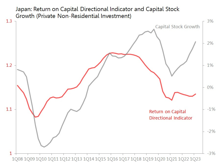 In the Dupont Analysis of corporate return on equity, the key metric for capital-intensive companies is usually asset turns (sales/total assets). For major economies, I construct a proxy for asset turns, using final spending on domestic product (ie, GDP ex-inventory movements) as the numerator, and an estimate of capital stock as the denominator. That estimate of capital stock is generated by depreciating all quarterly gross fixed capital formation over a 10-year period . These are done in nominal terms because i) ‘real’ capital stock calculations, although frequently made by people who should and probably do know better, are technically impossible; ii) balance sheet assets are nominal, not ‘real’, and balance sheet pressures will certainly affect corporate investment decisions.