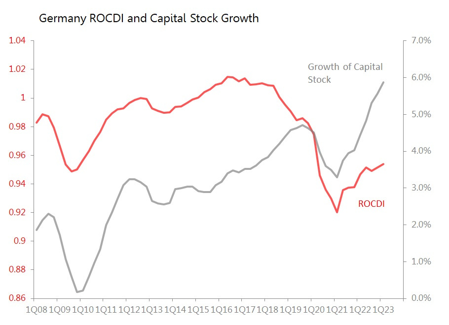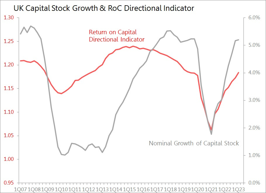 It will come as a considerable surprise to Britons (like myself), but on this metric at least, Britain looks likely to avoid recession, at least as far as investment-spending is concerned. ROCDI has returned to pre-pandemic levels, and continues to climb. The growth of capital stock has already returned to (but not exceeded) pre-pandemic levels, and - at least on its own terms - looks in no danger of needing to fall.