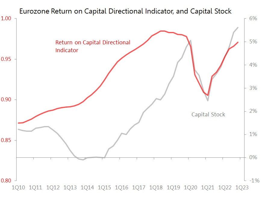 The Eurozone springs a surprise: by end-2022, the ROCDI has almost recovered to pre-pandemic levels, and capital spending has responded vigorously to that upturn. If the Eurozone is to enter recession in 2023, it will not be in response to a capital surplus generating a supply overhang.