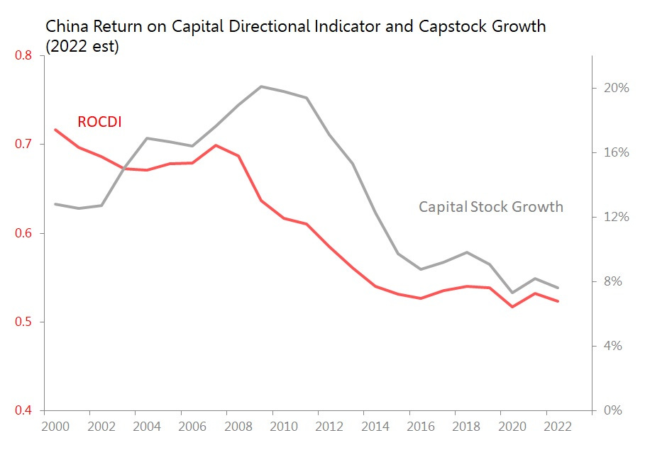 China’s national accounts details turn up late and are generally treated with scepticism - although the nominal data used in these calculations is probably less unreliable than the ‘real’ data used in headlines. The chart below includes data up to 2021, and an estimate for 2022 based on partial information. However, the story is clear: China’s ROCDI has been in retreat for years now, and eventually this has slowed the growth of its capital stock dramatically. The pandemic years seemingly changed nothing.